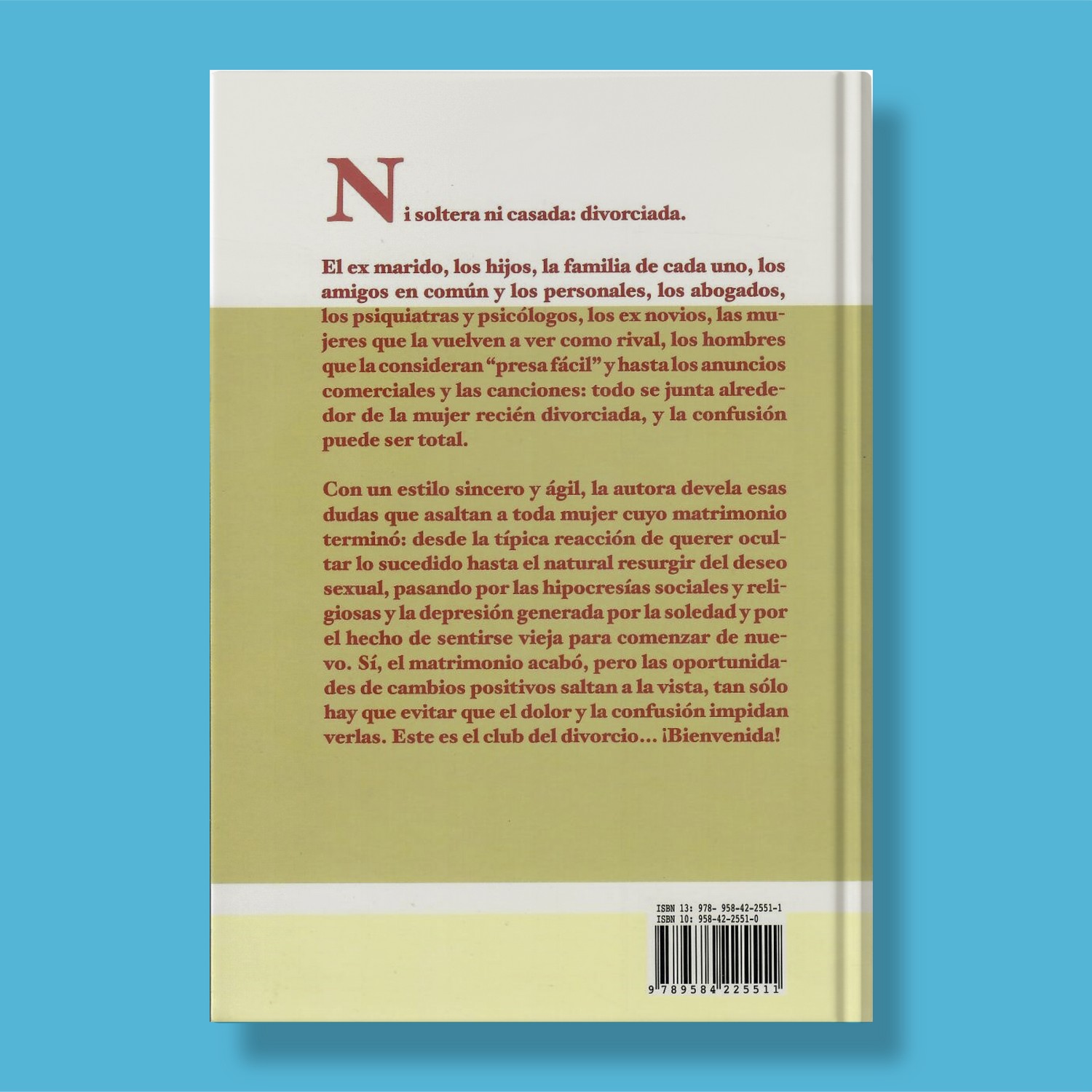 los psiquiatras y psicólogos, los ex novios las mujeres que la vuelven a ver como rival, los hombres que la consideran «presa fácil» y hasta los anuncios comerciales y las canciones: todo se junta alrededor de la mujer recién divorciada, y la confusión puede ser total. Con un estilo sincero y ágil, la autora devela esas dudas que asaltan a toda mujer cuyo matrimonio terminó: desde la típica reacción de querer ocultar lo sucedido hasta el natural resurgir del deseo sexual, pasando por las hipocresías sociales y religiosas y la depresión generada por la soledad y por el hecho de sentirse vieja para comenzar de nuevo. Sí, el matrimonio acabó, pero las oportunidad des de cambios positivos saltan a la vista, tan solo hay que evitar que el dolor y la confusión impidan verlas. Este es el club del divorcio… Bienvenida!