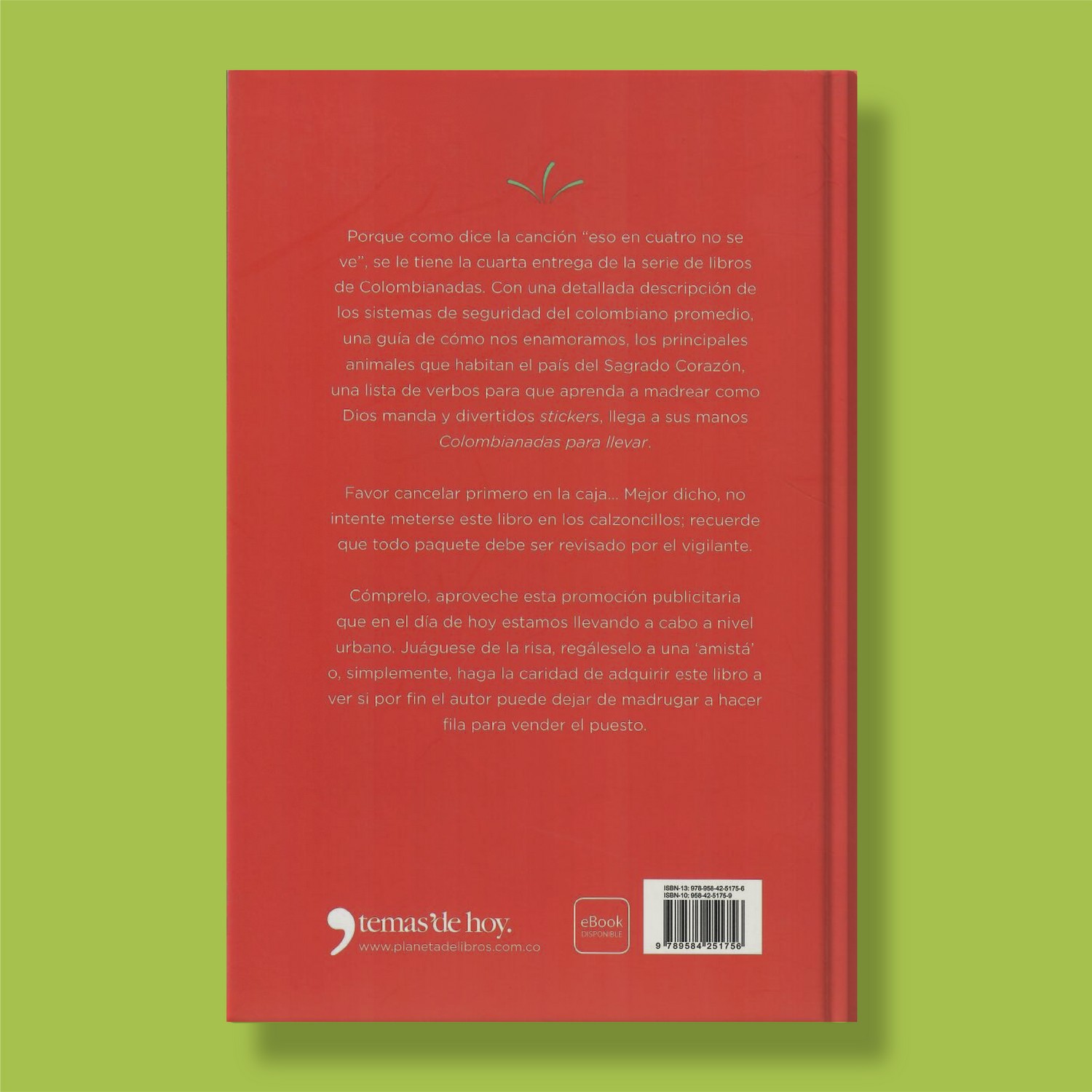 Porque como dice la canción “eso en cuatro no se ve”, se le tiene la cuarta entrega de la serie de libros de Colombianadas. Con una detallada descripción de los sistemas de seguridad del colombiano promedio, una guía de cómo nos enamoramos, los principales animales que habitan el país del Sagrado Corazón, una lista de verbos para que aprenda a madrear como Dios manda y divertidos stickers, llega a sus manos Colombianadas para llevar. Favor cancelar primero en la caja… Mejor dicho, no intente meterse este libro en los calzoncillos; recuerde que todo paquete debe ser revisado por el vigilante. Cómprelo, aproveche esta promoción publicitaria que en el día de hoy estamos llevando a cabo a nivel urbano